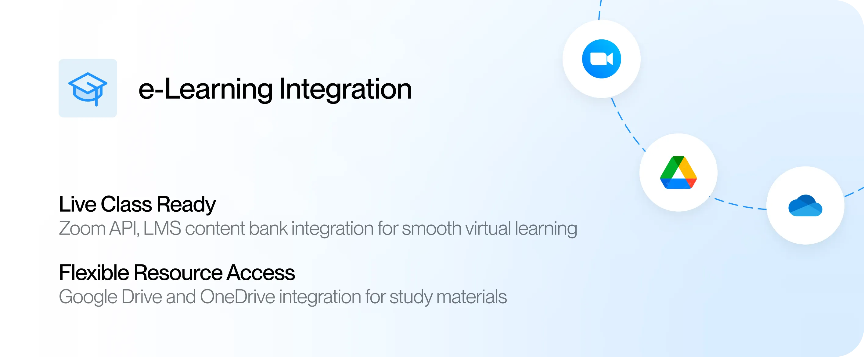 Facilitate online learning with Zoom integration, MCQ exams from a question bank, and real-time tracking of student participation and engagement.